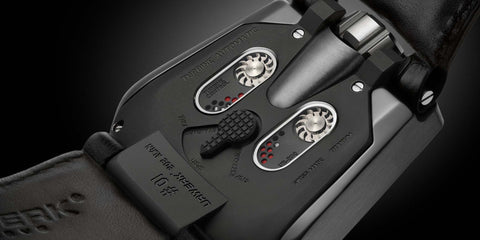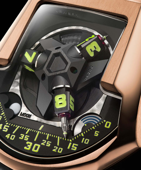 In 2008, URWERK unveiled the UR-202 "Hammerhead," a groundbreaking evolution of their wandering-hour satellite complication, featuring telescopic minute hands that extended and retracted to track the minutes with precision. Its bold, shark-inspired case and futuristic aesthetic embodied the brand's avant-garde spirit, capturing collectors' imaginations. The UR-202 also introduced an industry-first turbine-regulated winding system, allowing the wearer to adjust winding efficiency using miniature air turbines—an ingenious blend of traditional horology and cutting-edge innovation.