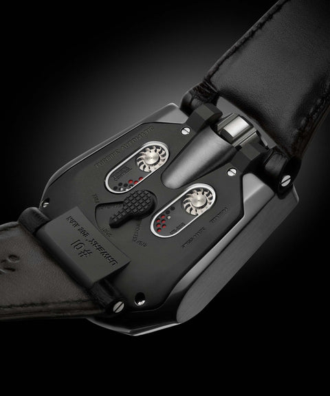 Released in 2010 as an ultra-exclusive evolution of the UR-202, the UR-203 took the Hammerhead’s pioneering mechanics a step further. Produced in a strictly limited edition of just 20 pieces, each crafted in platinum with a black PVD finish, the UR-203 showcased an open-worked dial that revealed its intricate mechanics. It retained the celebrated telescopic hands and turbine winding system from the UR-202, while reintroducing the unique "control board" complication featuring an oil-change indicator and a 150-year odometer—details originally seen on the UR-201. The UR-203 stands today as a rare and sought-after collector’s piece, beautifully exemplifying URWERK’s uncompromising dedication to mechanical innovation and artistic design.
