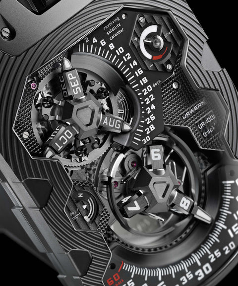 Encased in a massive, futuristic shell of black AlTiN-coated steel and titanium, the UR-1001 is an engineering marvel. On its front, it houses URWERK’s iconic satellite hour display, a retrograde minute track, day/night indicator, running seconds, and a power reserve. But it’s on the caseback that the Zeit Device becomes something else entirely—tracking not just the date and month, but also the year, 100-year, and 1,000-year indicators. It’s time on a cosmic scale, measured with mechanical poetry.
