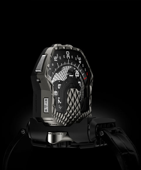 Unveiled in 2017 for URWERK’s 20th anniversary, the UR-T8 marked a bold reinvention of the wandering hours — and of the case itself. This was the brand’s first transformer watch: a reversible case that flips with a satisfying click to either reveal the time or protect it completely under a sleek, shield-like back.